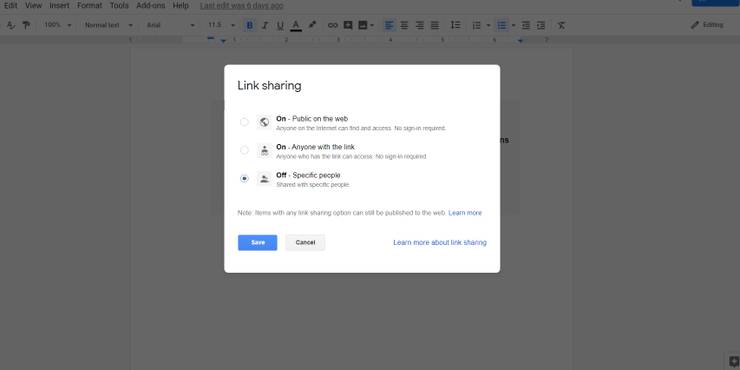 Jedním z nejjednodušších a nejefektivnějších způsobů bezpečného sdílení dokumentu Google je jeho sdílení s konkrétními osobami. Existuje několik způsobů, jak toho dosáhnout. Nejrychlejší způsob je nechat sdílení odkazů vypnuté a místo toho v možnostech sdílení odkazů vybrat možnost „Konkrétní lidé“. To vyžaduje, aby se druhá strana přihlásila k účtu Google, ale pokud práce znamená odeslání citlivých informací v dokumentu, pravděpodobně se vyplatí udělat krok navíc. Pokud soubor obsahuje odkazy a uživatel na ně klikne, adresa URL přesto sdělí ostatním webům, kde se uživatel nacházel, když na odkaz kliknul, neumožní však těmto webům číst samotný dokument, protože možnosti sdílení odkazů byly nastaveny tak, aby omezily přístup pouze na vybrané konkrétní osoby.