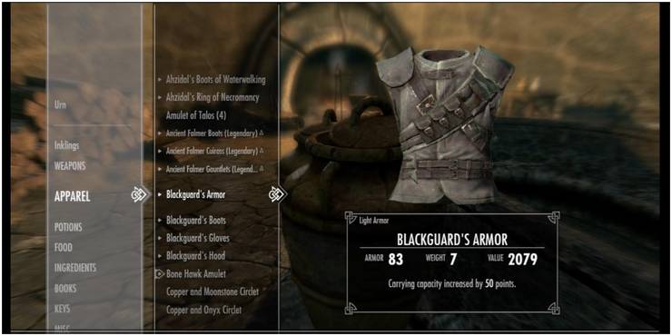 Nachdem der Spieler Glover Mallory in Ravenrock auf der Insel Solstheim geholfen hat, erhält er Zugang zu seinem geheimen Versteck und der Schwarzwächter-Rüstung. Glover ist Delvins Bruder, und so ist dieses Set eine verbesserte Version des Diebesgilden-Sets. Um Zugang zu dieser Rüstung zu erhalten, müssen die Spieler die Formel für die Bonemold-Rüstung von Esmonds Leiche in den Höhlen von Schloss Karstaag erhalten. Die Blackguard-Rüstung bietet einen vierzigprozentigen Bonus auf Schlösserknacken und Taschendiebstahl, perfekt für unternehmungslustige junge Diebe.