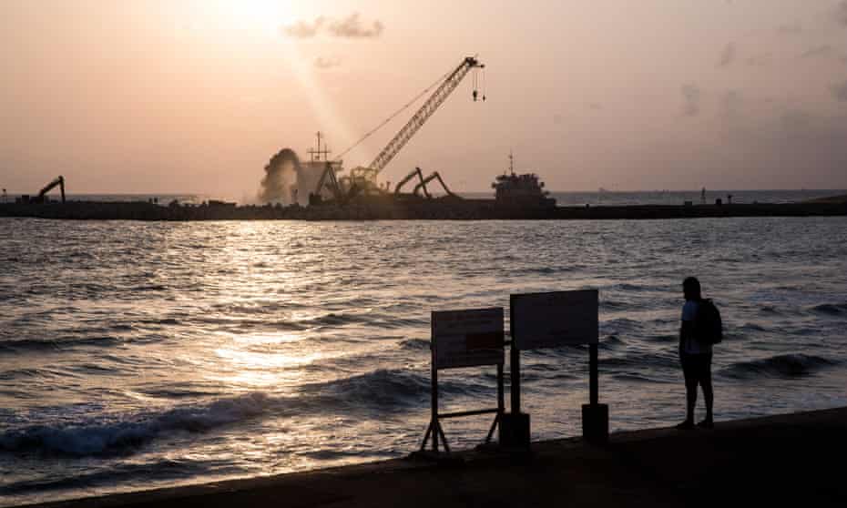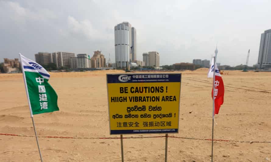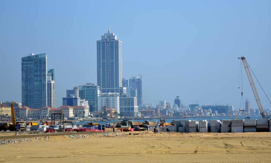- Újrahasznosított homokot szórnak a Srí Lanka-i Colombo International Financial City építkezésén; az építkezés általános képe; egy tábla az építkezésen