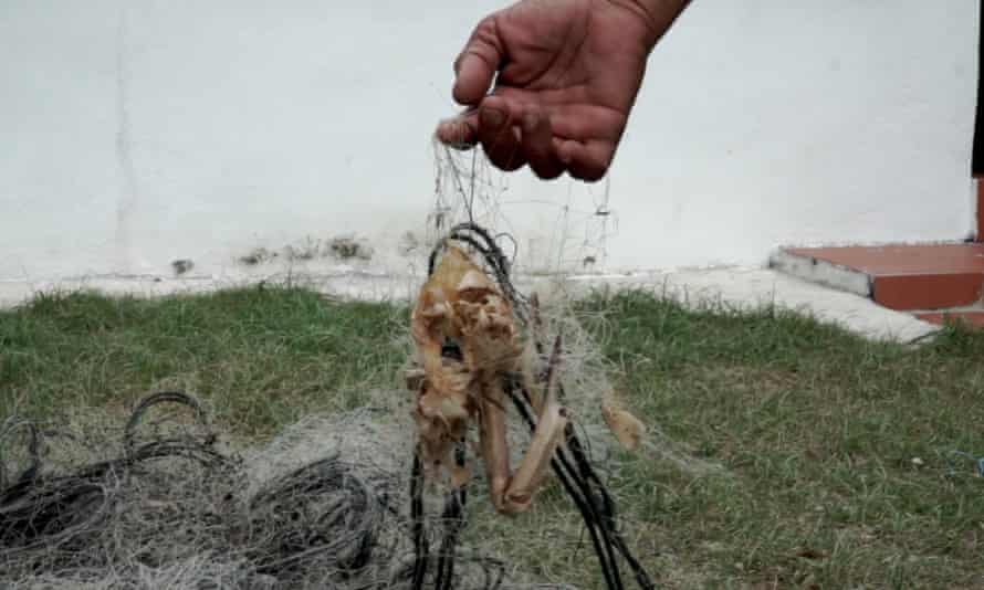 A lábainál széttépett régi hálók halmai hevernek. Kihúz egy kiszáradt rákot, és elmagyarázza, hogy az már jóval azelőtt halott volt, hogy belegabalyodott volna a hálójába. “A projektből származó sár megfojtja őket” – mondja.