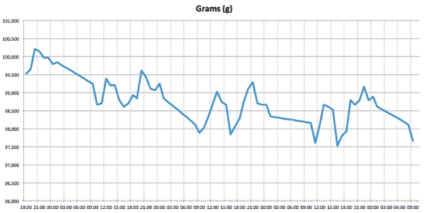 Więc podczas weekendu bank holiday, przeprowadziłem mały nienaukowy eksperyment na sobie. Zważyłem się w każdej godzinie czuwania, od 18:00 w piątek do 9:00 we wtorek i przyjąłem stałe tempo zmian w ciągu nocy, aby interpolować brakujące godziny snu. Zapisywałem z dokładnością do grama ilości, które zjadłem i wypiłem, a nawet ilość moczu, którą oddałem (oszacowałem te, er, inne rzeczy – mam trochę godności), i zapisywałem wszystkie ćwiczenia, które wykonywałem, ważąc się przed i po spacerach i biegach. Rezultatem był wspaniały arkusz kalkulacyjny pokazujący dokładnie, co działo się z moim ciałem godzina po godzinie przez prawie dziewięćdziesiąt godzin. Więc co znalazłem?